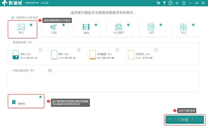 步骤1:下载好数据蛙数据恢复专家,打开该页面。在页面选择要恢复的文件类型以及勾选“回收站”(因为要恢复的是回收站被清空的数据,所以硬盘驱动器里面的内容跳过,直接选择回收站即可)。选择好后,点击“扫描”。