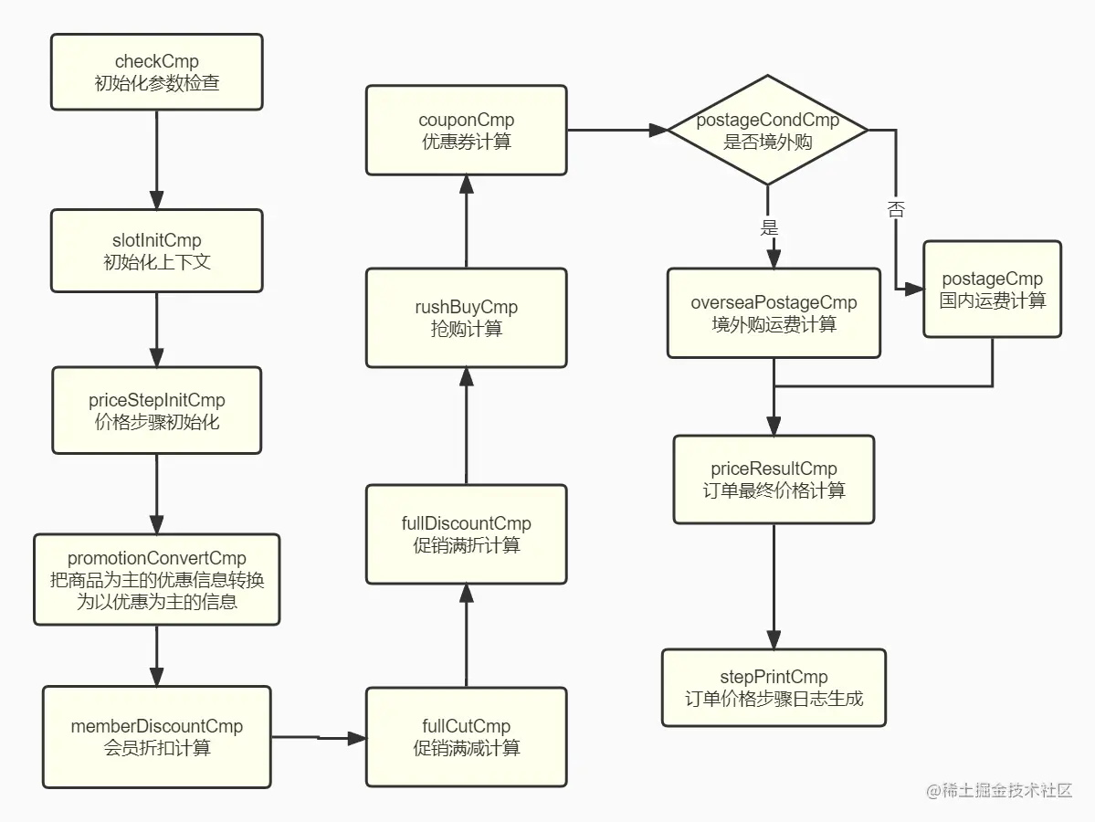 - 这个案例通过传入的订单数据,能计算出订单的最终价格,这里涉及到会员折扣、促销优惠、优惠券抵扣、运费计算等操作,多达十几步,如果不使用流程引擎的话实现起来是非常复杂的,下面是订单价格计算中各组件执行流程图;