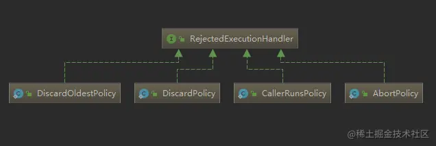 看到这里,我们发现RejectedExecutionHandler接口的实现类正是线程池默认提供的四种拒绝策略的实现类。