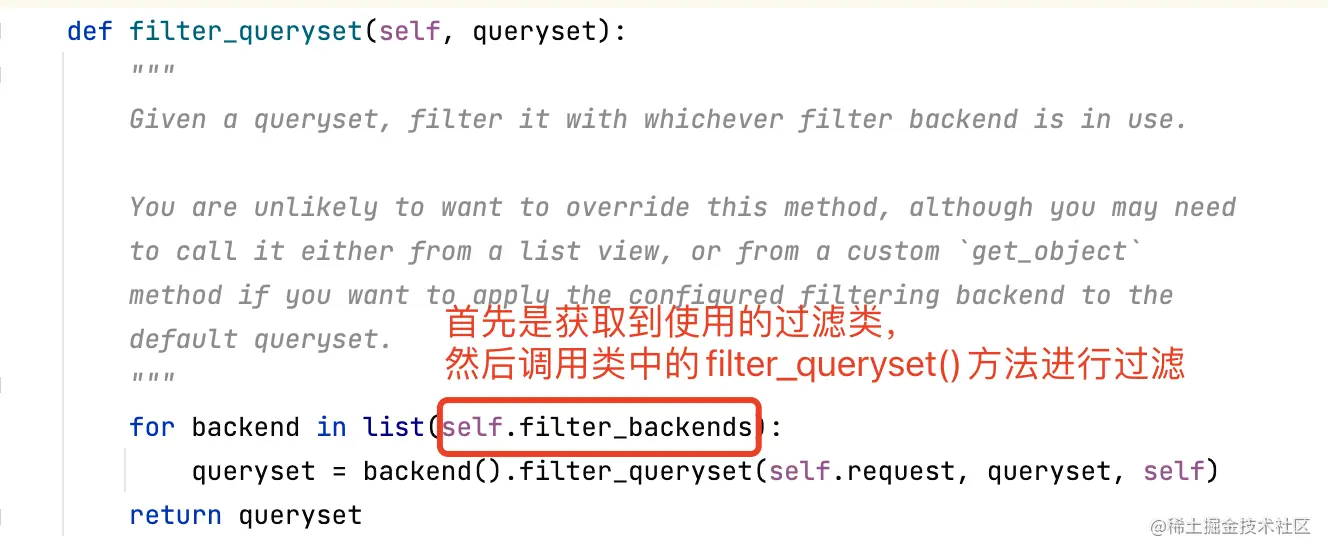 self.filter_backends主要获取配置的filterBackend类,调用类的filter_queryset()方法来实现参数查询的逻辑,self.filter_backends默认是api_settings.DEFAULT_FILTER_BACKENDS,这个就是在项目下的settings.py文件中进行配置的,因此filter_backends有两种配置方案,第一种是直接在settings.py文件指定DEFAULT_FILTER_BACKENDS,这个会对所有的View都生效,第二种方案是在单独的View类中进行配置,仅对当前这个View生效。