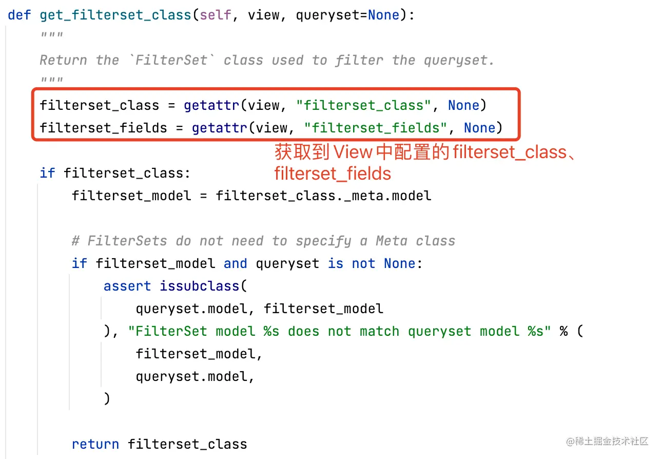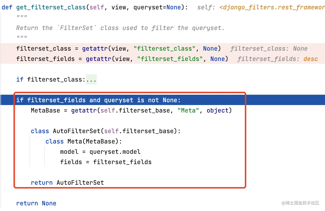 self.get_filterset_class获取过滤类然后从请求中获取请求参数,调用具体的过滤类,将请求参数作为传参。根据配置的方式不同,self.get_filterset_class有不同的逻辑,下面分开进行介绍。