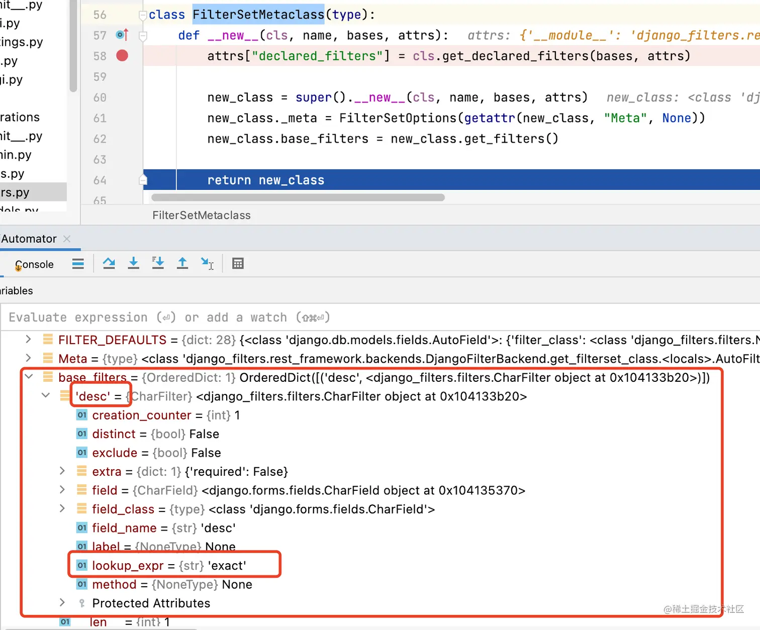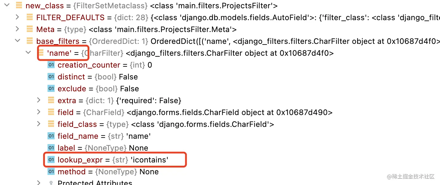 然后就是上诉两个方案相同的逻辑,即self.get_filterset方法最后返回的filter_class(**kwargs)。不同的是一个使用的是默认的AutoFilterSet,一个是自定义的ProjectsFilter。但是相同的逻辑是它们都继承于FilterSetMetaclass,从类名可以看出来,这是一个元类,即生成类的类,它的主要功能就是根据字段名设置过滤字段,例如默认的AutoFilterSet将会根据字段设置base_filter,并且匹配规则为'exact',即完全匹配,这也就是为什么filterset_fields无法完成模糊搜索等高级功能的原因。