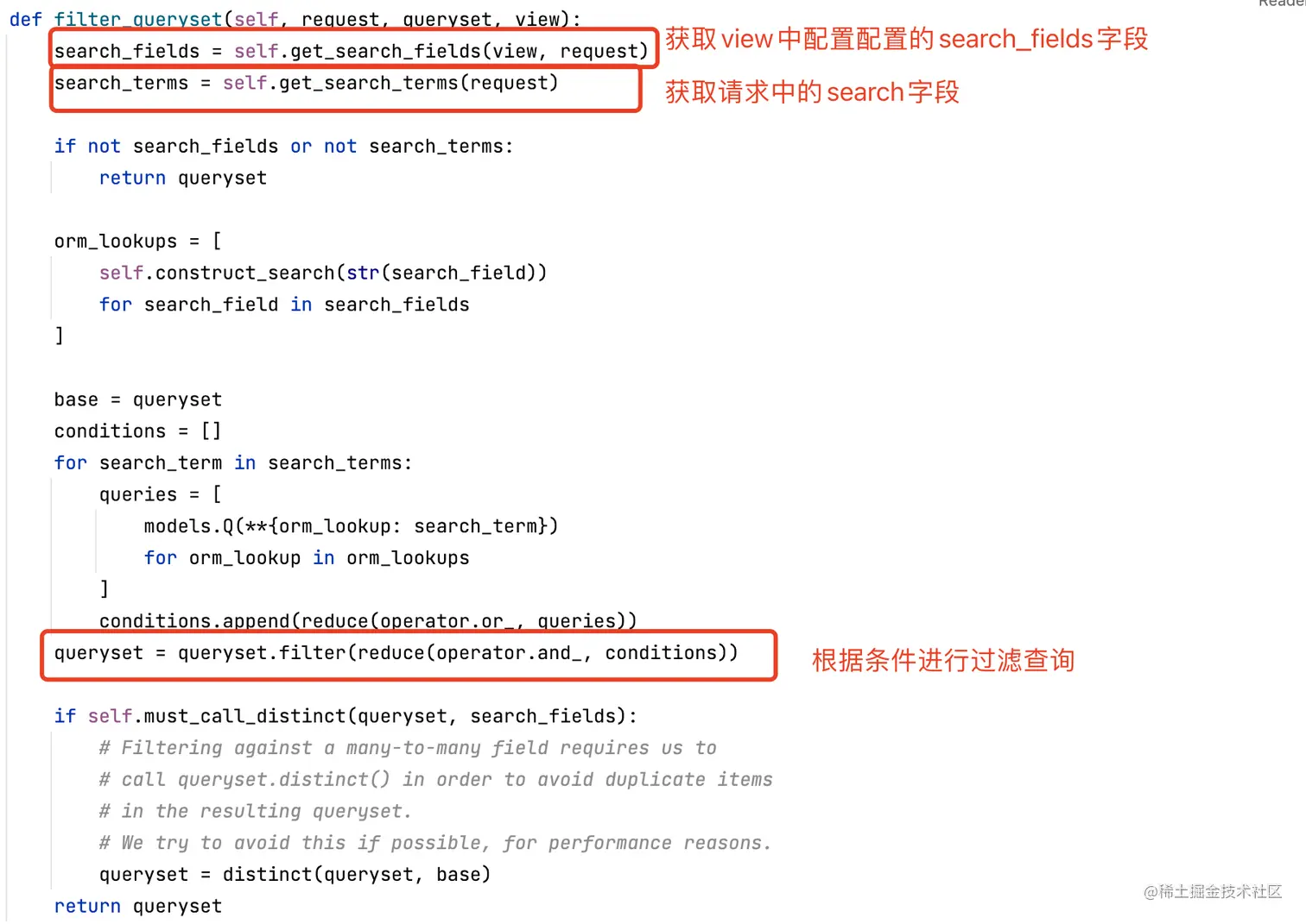 接下来通过源码来看看它是如何实现的。上面已经知道,是通过配置的filterBackend类的filter_queryset方法实现的。所以可以直接看SearchFilter的filter_queryset方法。