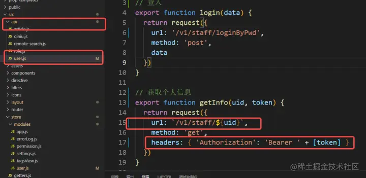 同样找到获取个人信息接口,替换成我们自己的接口地址,请求传参写法参考axios官方文档 ,我这里token是放在headers中的所以写成上图形式,返回的参数可以参考mock中原先的示例