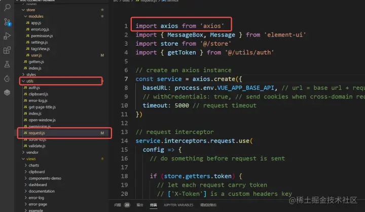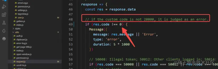 重点看着一段,定义了code为20000时请求算成功,根据我们自己的后端接口可以重新定义,比如我的接口返回code为0是正确的
