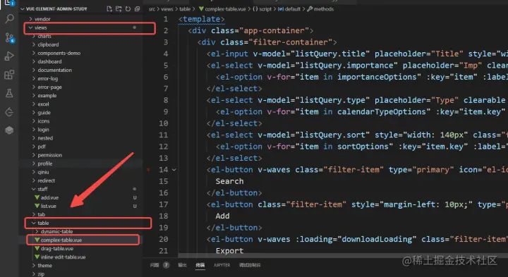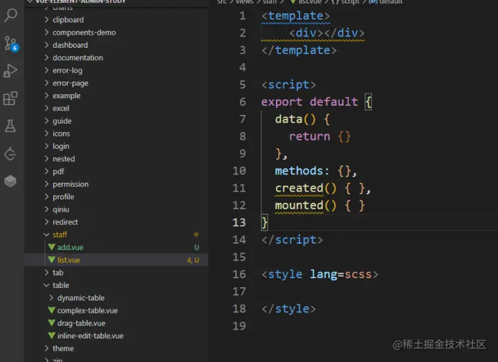 回到我们/views/staff/list.vue文件,我们现在要做一个正常的表格页面,包含搜索查询功能