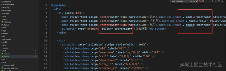 给输入框绑定对应的参数,按钮绑定获取列表的方法(部门那一行model拼错了,不重新截图了)