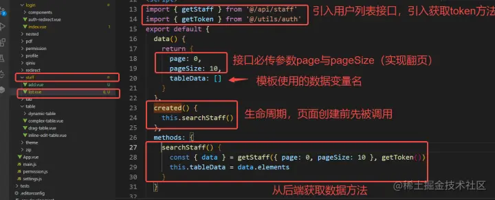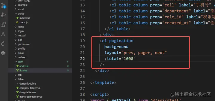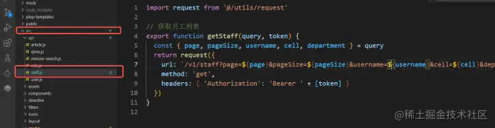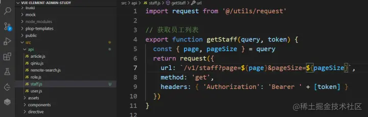 在api文件夹下新建 staff.js文件,用于存放员工管理相关的接口请求(结构参考之前的user.js即可),传参只填上必须的token,page,pageSize,其他的搜索字段之后再补全