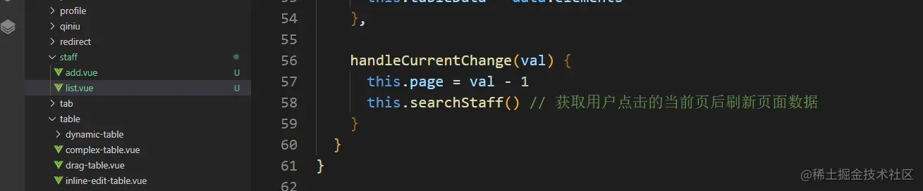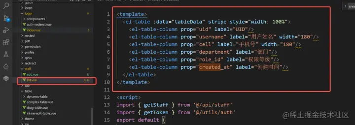 我们把该页面复制到我们/views/staff/list.vue里面