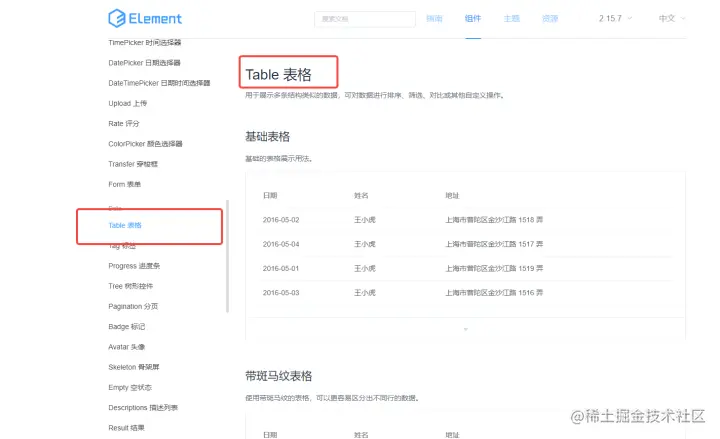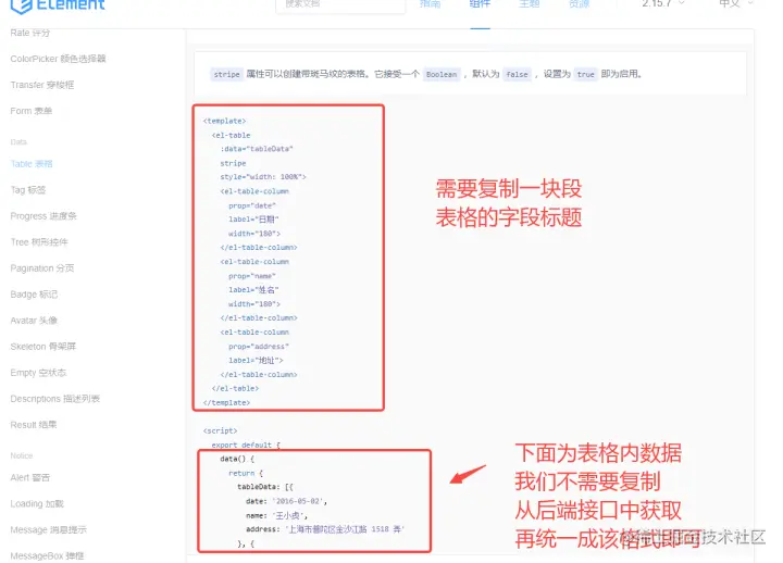 我们参考element-UI组件库,找到合适的组件,比如这个表格肯定是必要的,点开向下箭头可以看到代码