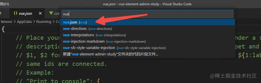 进入文件——首选项——用户片段——输入选择Vue.json,如果搜不到这个文件就直接搜索vue,没有.json后缀的那一栏点击以下就会出现该文件了