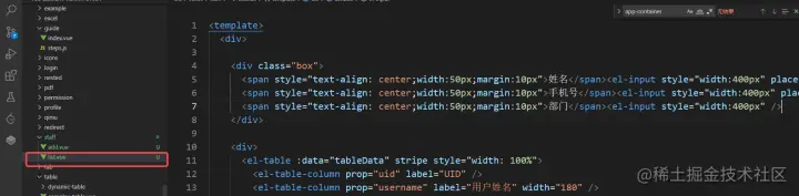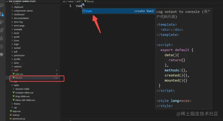 回到我们员工列表的页面文件,输入vue 回车即可