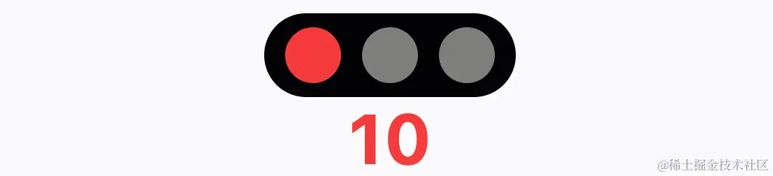 如下所示,信号灯由三个 Lamp 组件和数字构成。三个灯分别表示 红、黄、绿 ,某一时刻只会量一盏,不亮的使用灰色示意。三个灯水平排列,有一个黑色背景装饰,和文字呈上下结构。