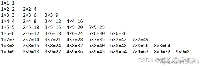 练习2:使用双重for循环输出九九乘法表,外层循环控制行数,九九乘法表,一共有9行