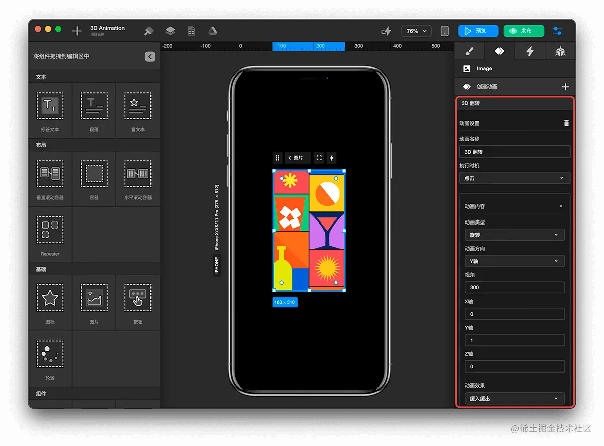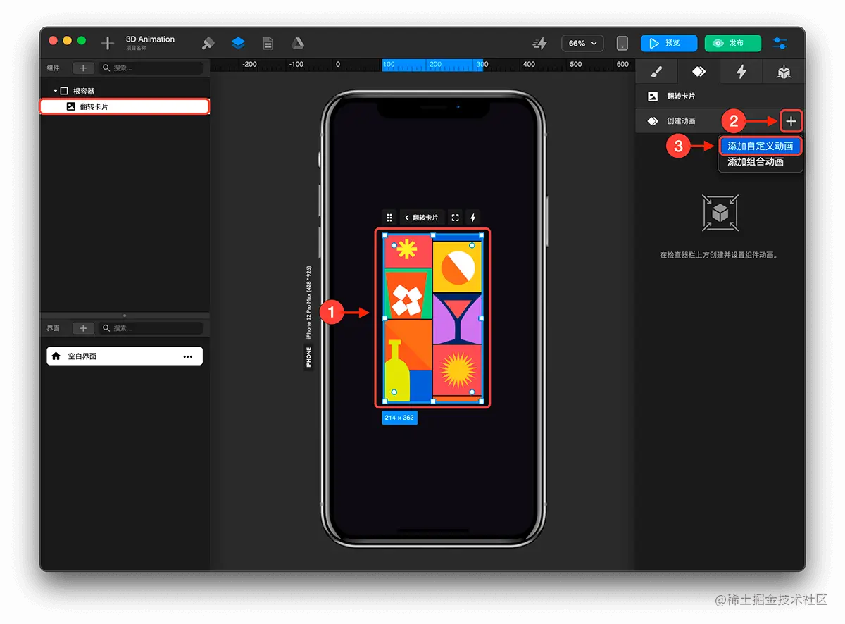 在Towify中如何配置 3D 翻转动画? TOWIFY 2022-09-27 137 阅读1分钟 效果展示: # **前置准备:** 准备需要执行翻转动画的卡片(下文简称“翻转卡片”) 步骤分解: 创建自定义动画 选中翻转卡片 点击 + 按钮 添加 自定义动画 配置动画效果 选中图片组件 点击检查面板中的动画面板 配置动画