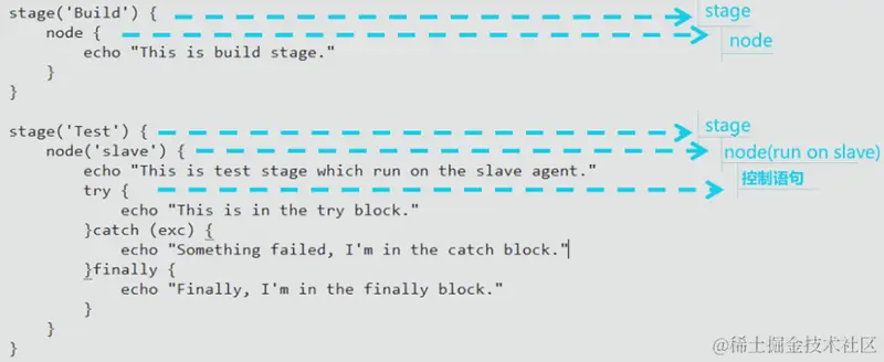 一个 Script Pipeline 可以划分成若干个 Stage,每个 Stage 代表一组操作,例如 Build,Test;Node 代表 Jenkins 节点,比如 Master, Slave 这样的节点;Step 是最基本的操作单元,在对应 Node 节点上执行的动作语句直接写在 node {} 中。
