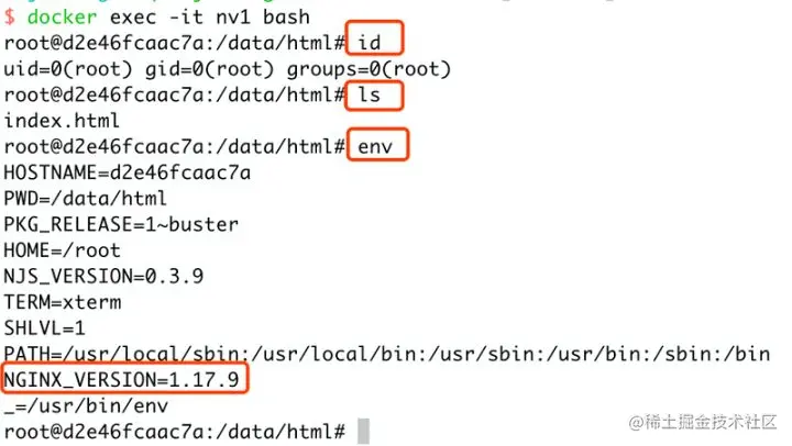 使用 env 命令可以查看当前环境下有一个变量 NGINX_VERSION=1.17.9 这个是 ENV 指令指定的信息。\
