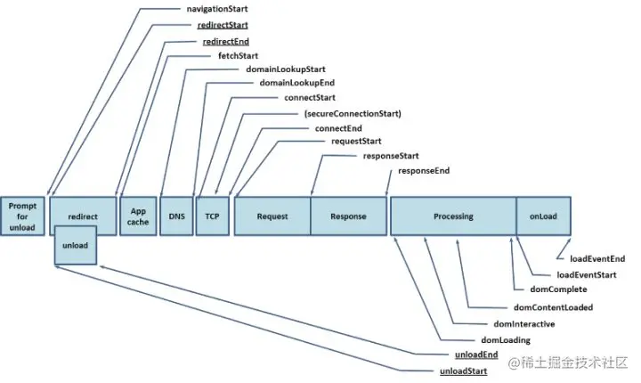• Prompt for unload 访问一个新页面时,旧页面卸载完成的时间 • redirect 重定向,用户注销登陆时返回主页面和跳转到其它的网站等 • App cache 检查缓存,是否打开 • DNS 表示 DNS 查询的时间,如果是长连接或者请求文件来自缓存等本地存储则返回fetchStart时间点 • TCP 与服务器建立链接的时间 • Requests 客户端发起请求的时间 • Response 拿到服务器第一个响应字节到最后一个响应字节的时间 • Processing 各种状态的时间点,例如加载状态等等 • onLoad 触发load事件执行的时间