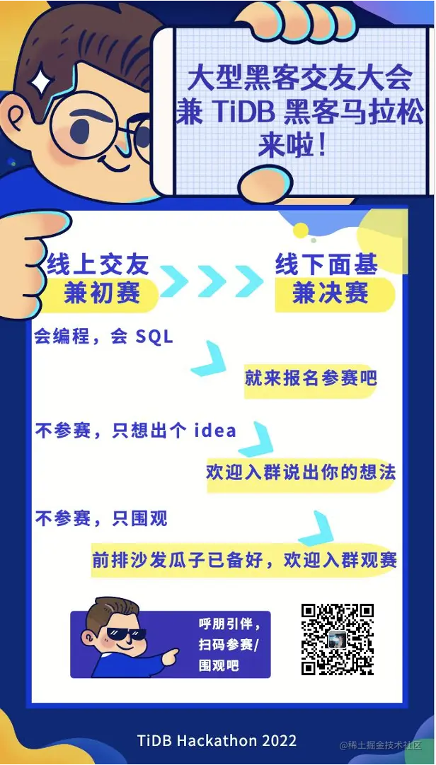 一年一度黑客们的狂欢——TiDB Hackathon 2022 报名已开启,万元奖金等你来拿,还有技术专家、顶级投资人全程坐镇,你的实力将被更多人看到。