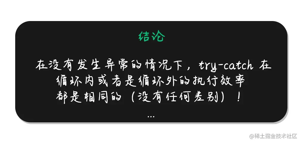 也就是说,在没有发生异常的情况下,除去误差值,我们得到的结论是:try-catch 无论是在 for 循环内还是 for 循环外,它们的性能相同,几乎没有任何差别。