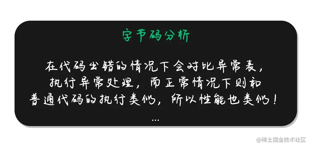 从字节码指令可以看出,当代码运行时出错时,会先判断出错数据是否在 from 到 to 的范围内,如果是则从 target 标志位往下执行,如果没有出错,直接 goto 到 return。也就是说,如果代码不出错的话,性能几乎是不受影响的,和正常的代码的执行逻辑是一样的。