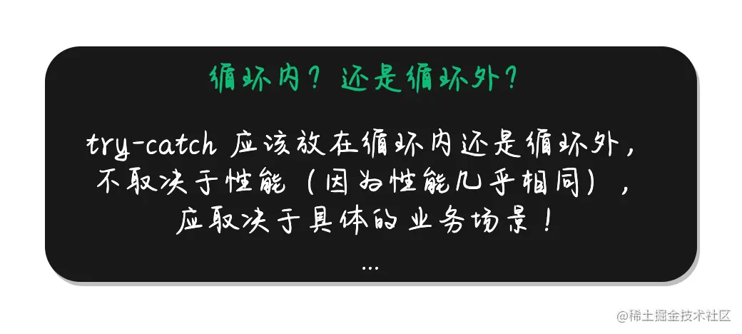 因此我们在决定 try-catch 究竟是应该放在循环内还是循环外,不取决于性能(因为性能几乎相同),而是应该取决于具体的业务场景。