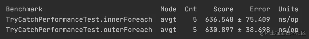 - 循环外包含 try-catch 的平均执行时间是 630 纳秒,上下误差 38 纳秒。