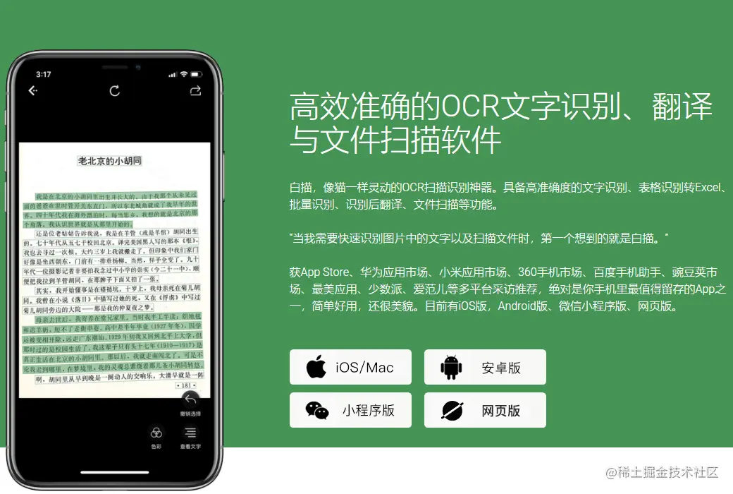 白描,像猫一样灵动的ocr扫描识别神器。具备高准确度的文字识别、表格识别转Excel、批量识别、识别后翻译、文件扫描等功能。
