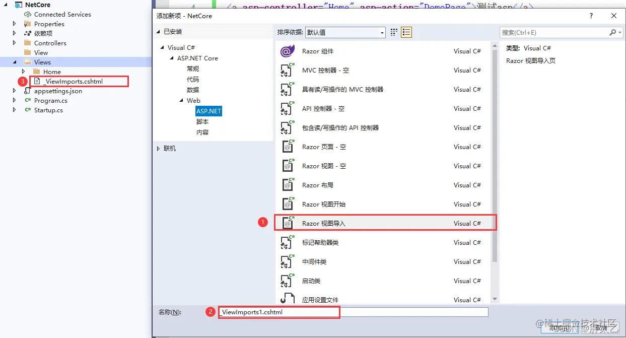 1.我们需要在视图Views目录下创建一个Razor视图导入,默认取名为“_ViewImports.cshtml”