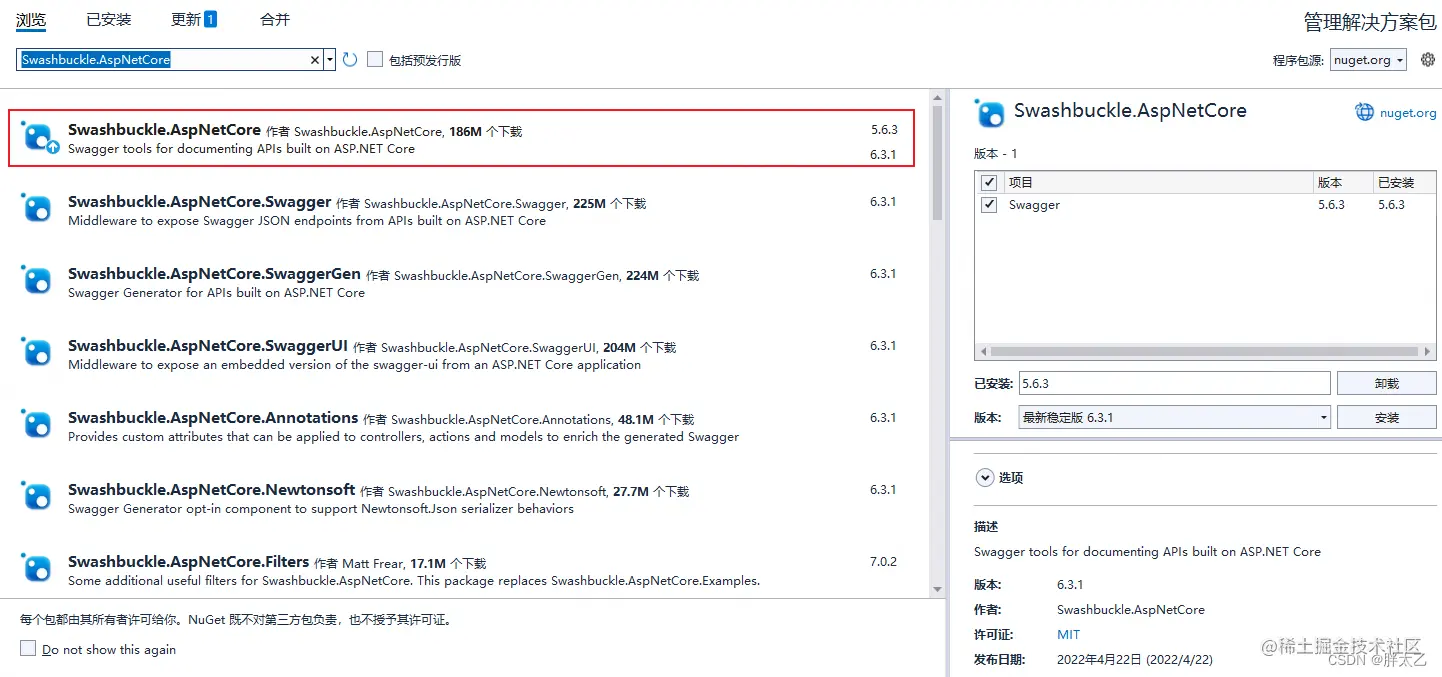 1.再NuGet包管理器中搜索 “Swashbuckle.AspNetCore” 并且进行安装