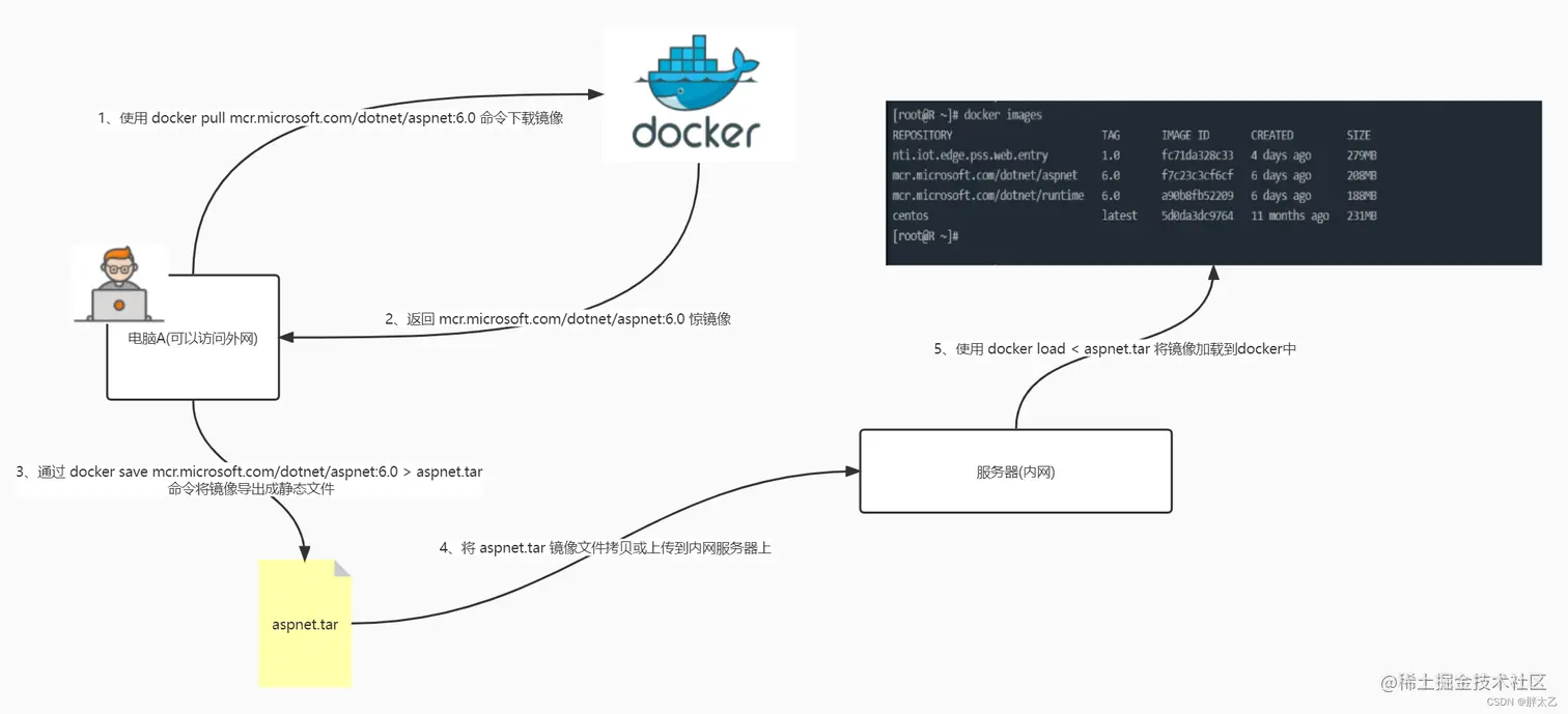 其实联网部署和离线部署的步骤大同小异, 唯一的区别就是,离线安装没办法通过“ docker pull 镜像” 的方式获取到 .net core 6.0 运行所需要的环境(ASP.NET Core 6.0 运行时),所以我们只要解决了镜像问题, 那么离线部署的问题就解决了。而 docker 官方提供了Save 和 load 来实现镜像的导出和导入。 官方文档地址:docker save | Docker Documentation ,这里就不过多介绍了。