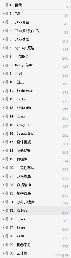 JVM,JAVA集合,JAVA多线程并发,JAVA基础,Spring 原理,微服务,Netty与RPC,网络,日志,Zookeeper,Kafka,RabbitMQ,Hbase,MongoDB,Cassandra,设计模式,负载均衡,数据库,一致性算法,JAVA算法,数据结构,加密算法,分布式缓存,Hadoop,Spark,storm,YARN,机器学习,云计算。
