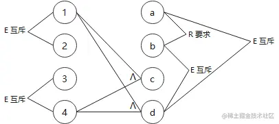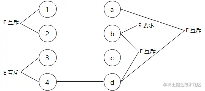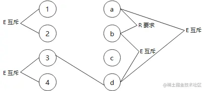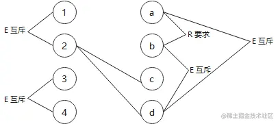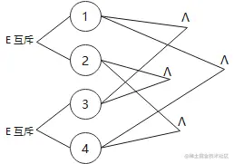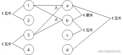 - 互斥 E:a、b、c 只能有一个成立,但是可以都不成立。