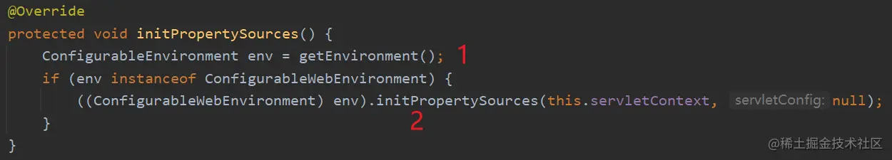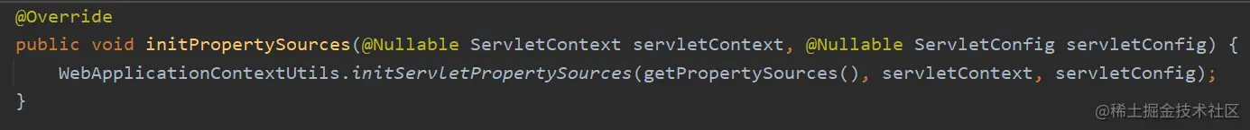 在方法内部调用了WebApplicationContextUtils.initServletPropertySources()方法,由名称可得知,它用于初始化 Servlet 的属性资源,在实际执行过程中分别根据 ServletContext 和 ServletConfig 的值来判定是否要将指定的配置包装为 ServletContextPropertySource 和 ServletConfigPropertySource 对象.