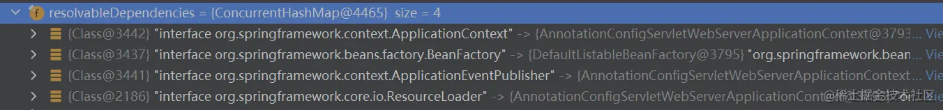 registerResolvableDependency()方法,则是往 beanFactory 的 Map 类型的 resolvableDependencies 属性设置值。