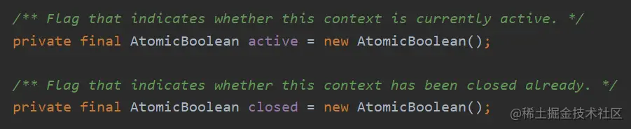 活动标记使用两个 boolean 类型的原子变量来完成,这里将 active 设置为 true,closed 设置为 false。