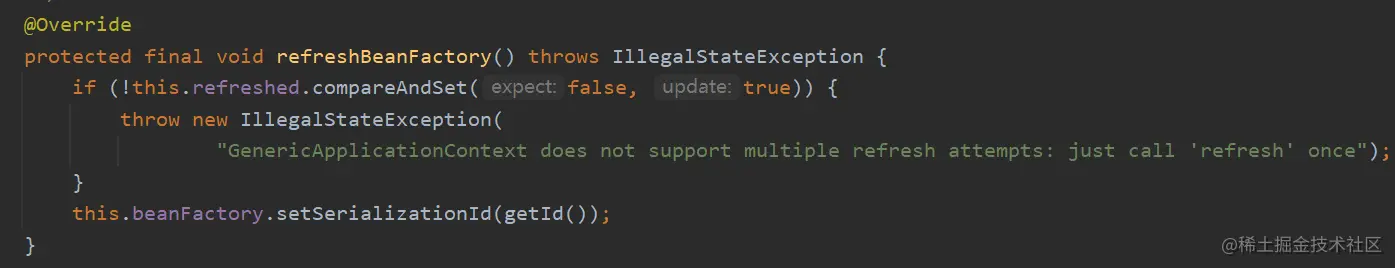 内部调用了refreshBeanFactory()方法,该方法由 AbstractApplicationContext 的子类GenericApplicationContext来实现,进入子类的 refreshBeanFactory() 方法如下: