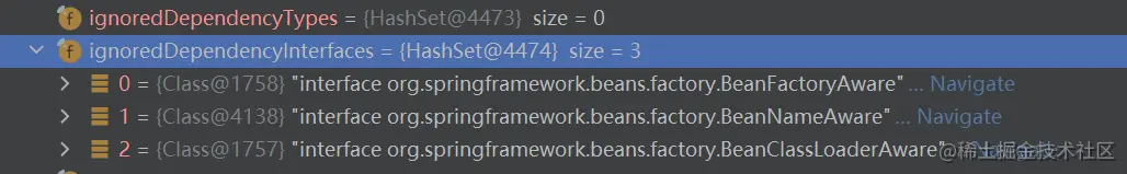 ignoreDependencyInterface()方法则是往 beanFactory 的ignoredDependencyInterfaces属性中添加需要被忽略的接口,在添加之前,已经存在3个如下: