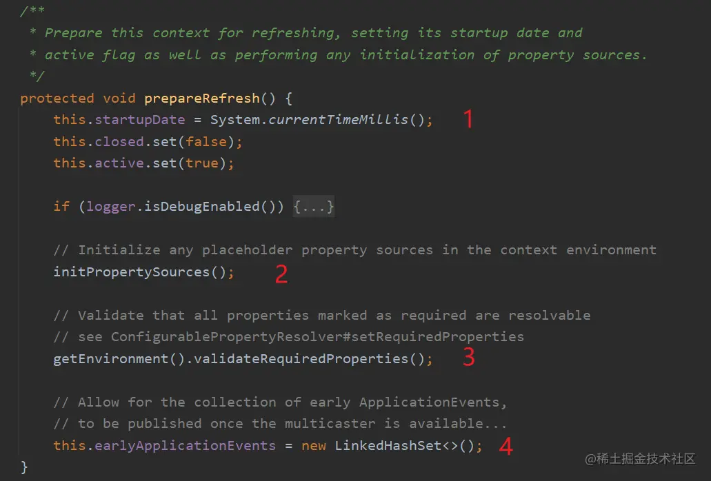 进入prepareRefresh()方法,方法上的注释如下:Prepare this context for refreshing, setting its startup date and active flag as well as performing any initialization of property sources.