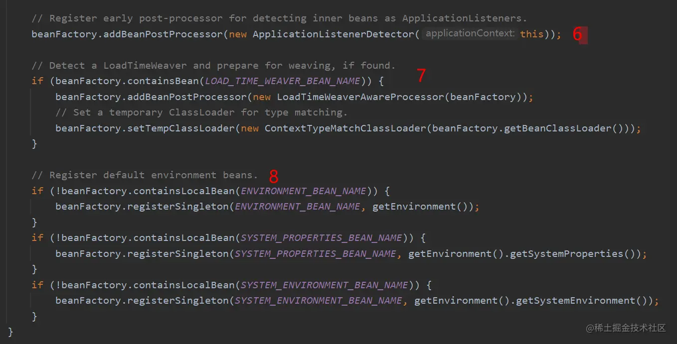 方法上注释:Prepare the bean factory for use in this context. 翻译过来就是:准备 bean 工厂以在此上下文中使用。
