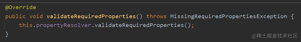 方法上的注释:Validate that all properties marked as required are resolvable see ConfigurablePropertyResolver#setRequiredProperties。 翻译过来就是:验证所有标记为必需的属性都是可解析的,参见 ConfigurablePropertyResolver#setRequiredProperties。