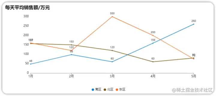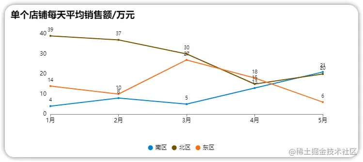 图表显示横轴是月份,纵轴是每天平均销售额,从折线图的数据趋势看来,北区的业务似乎没有其他地区的好。