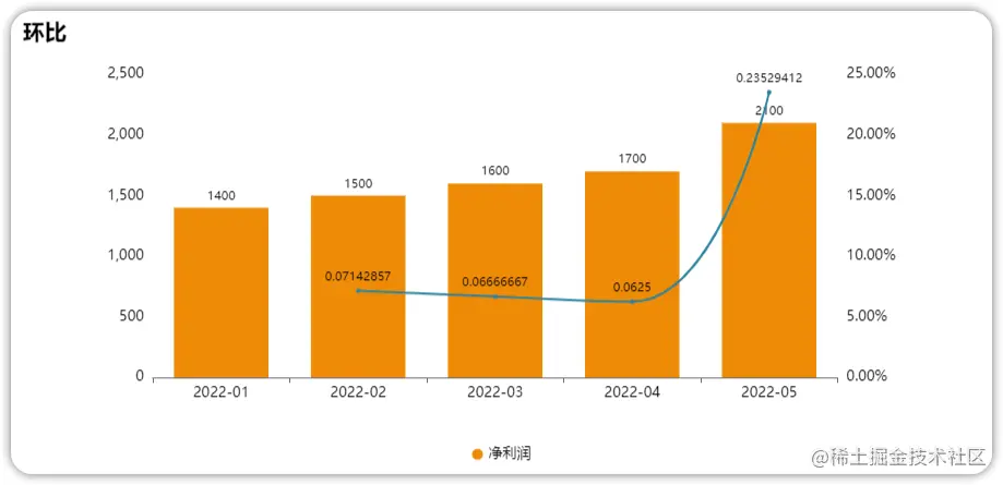 环比和上一个时间段对比,用于观察短期的数据集,如下图所示,图表的横轴是年份月份,纵轴是净利润与环比百分比值。