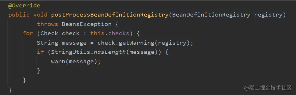 接着遍历的是 ConfigurationWarningsPostProcessor,其实现了 BeanDefinitionRegistryPostProcessor 接口。所以会进入它的postProcessBeanDefinitionRegistry()方法如下: