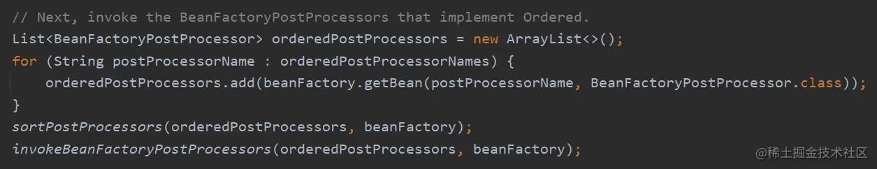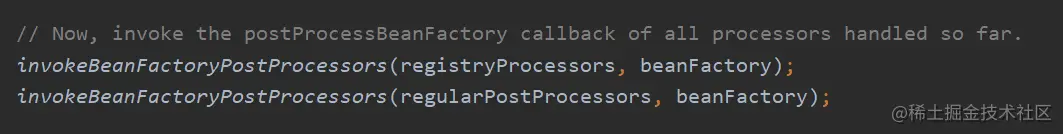 Invoke factory processors registered as beans in the context. 翻译过来就是:调用在上下文中注册为 bean 的工厂处理器。