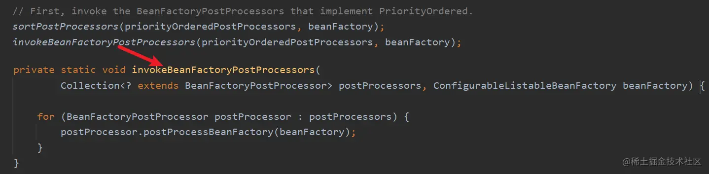 进入invokeBeanFactoryPostProcessors()方法,