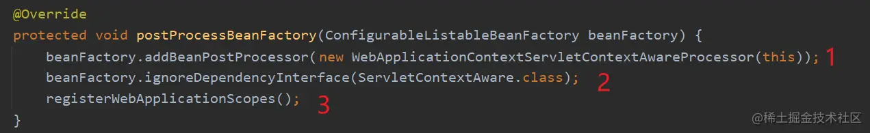 1.向 beanFactory 中添加了一个叫WebApplicationContextServletContextAwareProcessor的 bean 后置处理器。