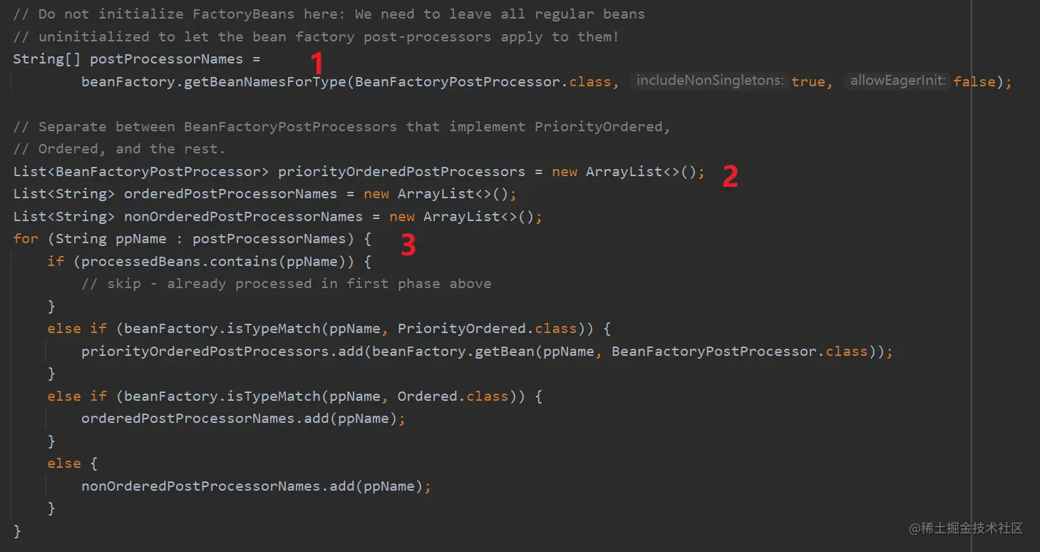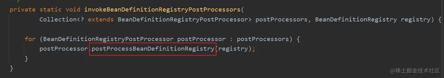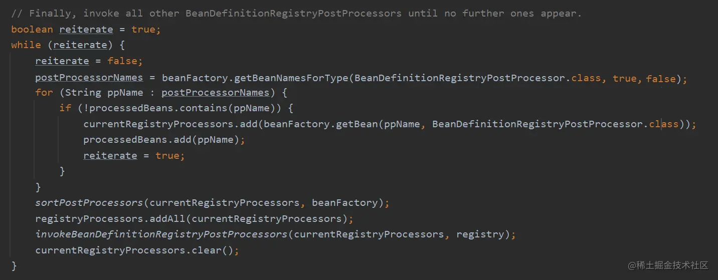 使用一个 while 循环来处理,因为每次处理,都有可能增加 BeanDefinitionRegistryPostProcessor。