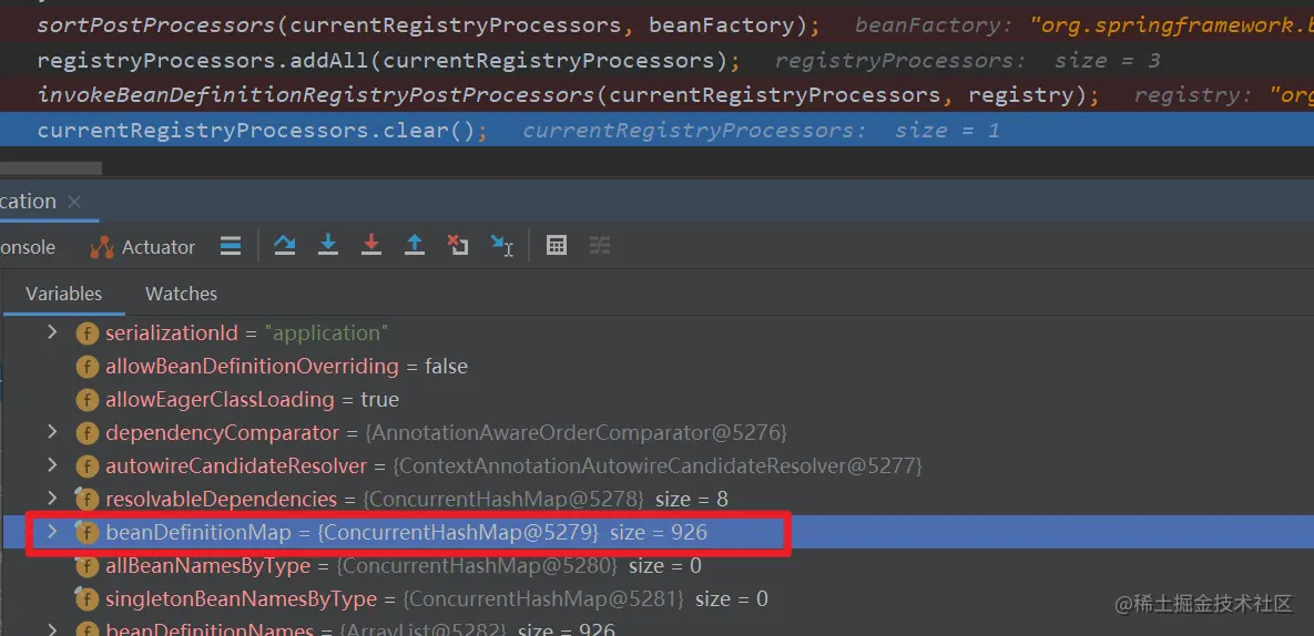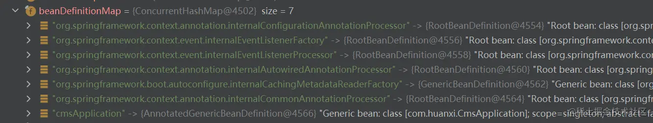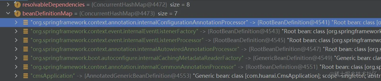 这个 PostProcessor 可以说是 SpringBoot 中最重要的一个 BeanFactoryPostProcessor,它负责将项目中所有注册的 bean 解析为 beanDefinition,当该 后置处理器执行完毕后,此时查看 beanFactory 中的 beanDefinitionMap 如下: