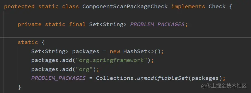 它是在 创建 ConfigurationWarningsPostProcessor 对象时,创建了 ComponentScanPackageCheck 对象,并赋值给 checks 的。